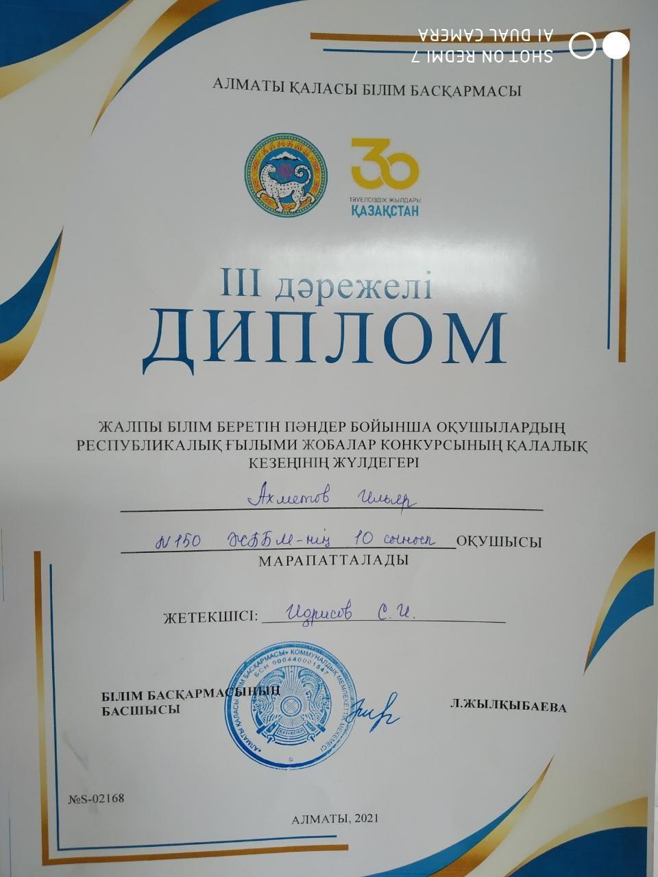 Алматы қаласы Білім басқармасының «Алматы дарыны» дарынды балалар мен талантты жастарды анықтау және қолдау жөніндегі орталығының ұйымдастыруымен «Тұран» университетінде өтілген жалпы білім беретін пәндер бойынша республикалық ғылыми жобалар конкурсының қалалық кезеңіне мектебіміздің 10 «А» сынып оқушысы Ахметов Ильяр информатика пәнінен қатысып, жүлделі ІІІ орынға ие болды. Жетекшісі Идрисов С.И Мектеп директорының м.а Имашев М.А оқушымызды жеткен жетістігімен құттықтап,дипломын табыстады.