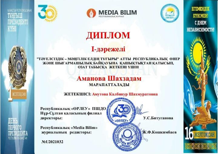 "Тәуелсіздік-мәңгілік елдің тұғыры" атты республикалық өнер және шығармашылық байқауына қашықтықтан қатысып, озат табысқа жеткені үшін 5 "Б" сынып оқушысы Аманова Шахзадам І дәрежелі дипломмен марапатталды. Жетекшісі Амутова К.Ш Құттықтаймыз!!!