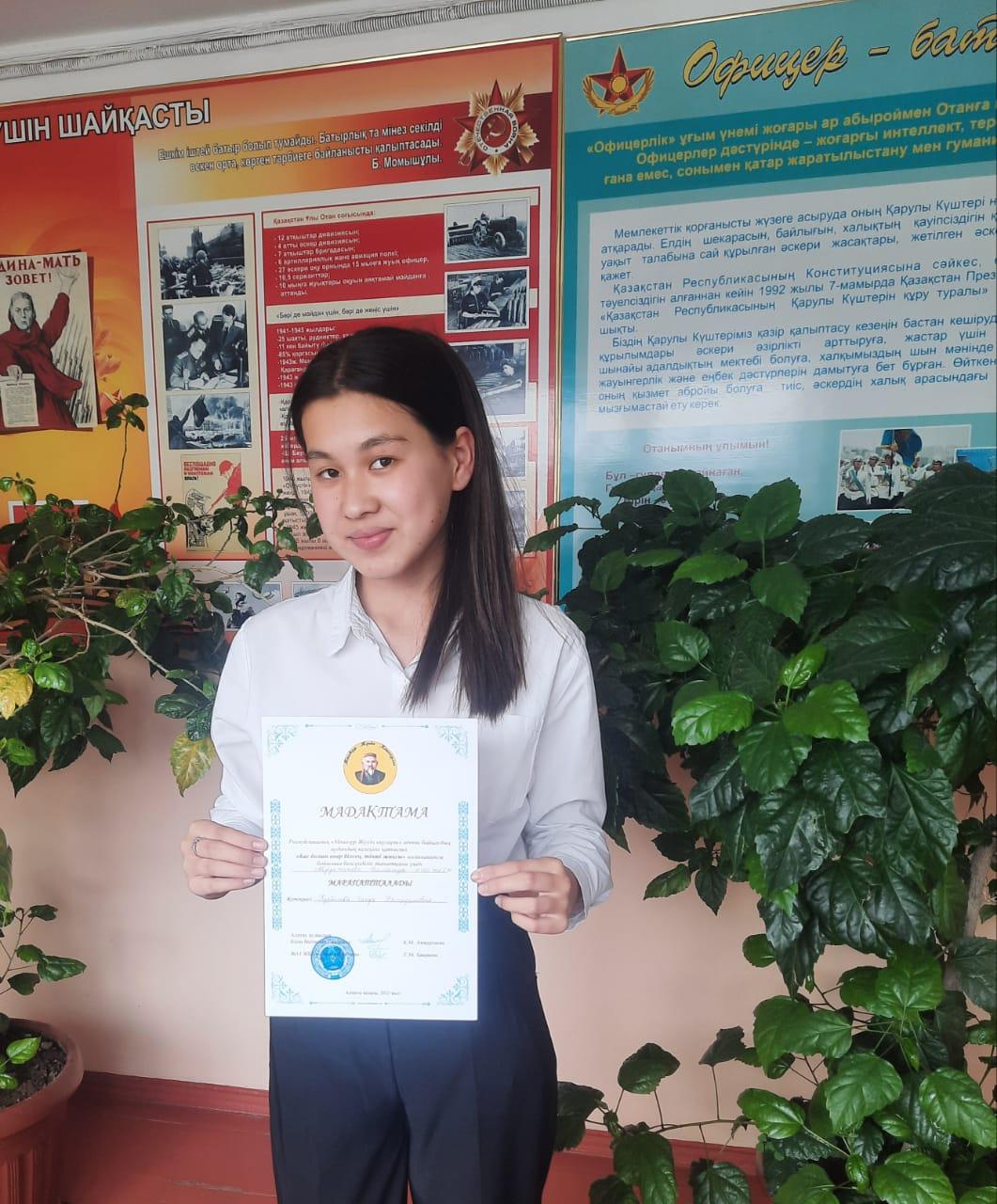 Республикалық «Мәшүр Жүсіп оқулары» атты ғылыми жобалар байқауының аудандық кезеңіне қатысып, «Бас болып өнер білсең, тіпті жақсы» номинациясы бойынша 8 А сынып оқушысы Абдулжанова Илминур марапатталды. Жетекшісі:Курбанова С.Н