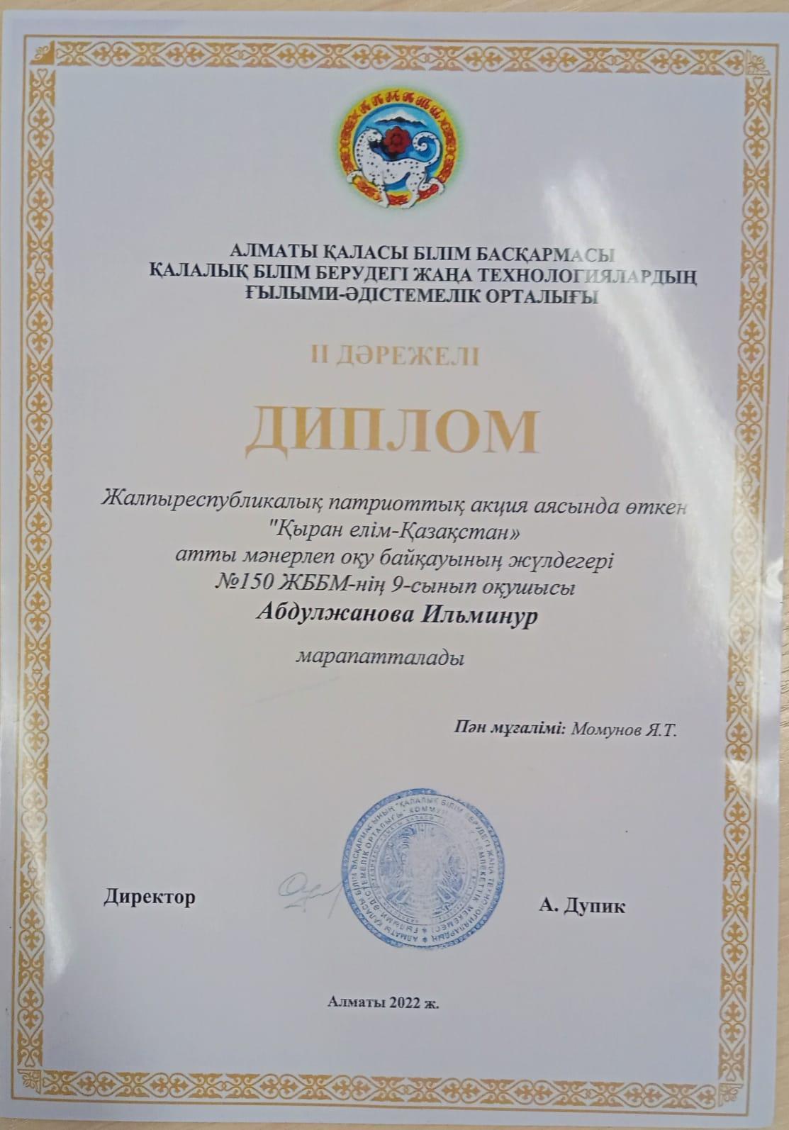 Жалпыреспубликалық патриоттық акция аясында өткен «Қыран елім-Қазақстан» атты мәнерлеп оқу байқауына №150 ЖББ мектебінің 9 «Б» сынып оқушысы Абдулжанова Ильминур қатысып, II дәрежелі дипломмен марапатталды. Оқушымыздың мәнерлеп оқыған өлеңі мен әні көпшілік көңілінен шықты.