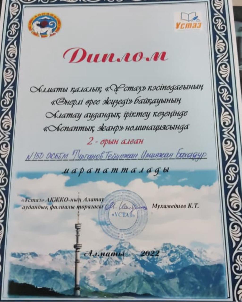 Алматы қалалық “Ұстаз” кәсіподағының “Өнерлі өрге жүзеді” байқауының Алатау аудандық іріктеу кезеңінде “Аспаптық жанр” номинациясында М.Хамраев атындағы 150 ЖББ мектептің мұзыка пәні мұғалімі Турганов Т.А. II орын иегері атанды. Құттықтаймыз!
