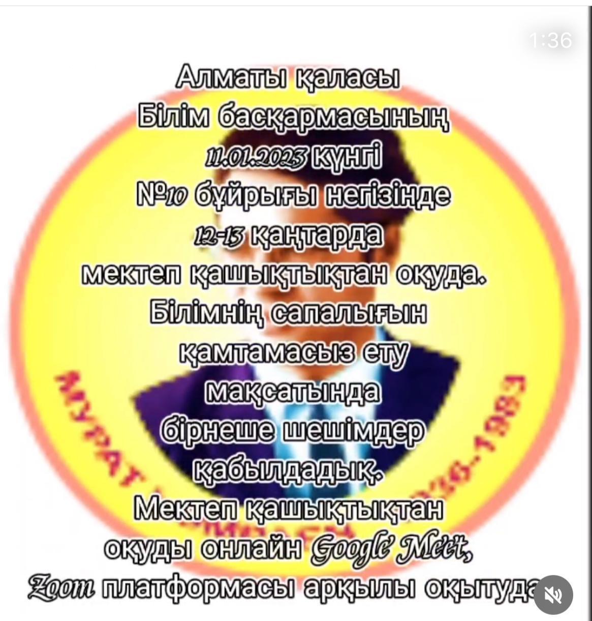 Алматы қаласының білім басқармасының №10 бұйрығына сәйкес М.Хамраев атындағы №150 ЖББ мектепте ауа райының қолайсыздығына байланысты 2023 жылғы 12-13 қаңтар күндері қашықтан оқыту талаптары мен ережелеріне сәйкес сабақтарды Zoom және Google Meet платформалары арқылы өтуде. Жеңілдетілген пәндер асинхронды форматта өткізілуде.