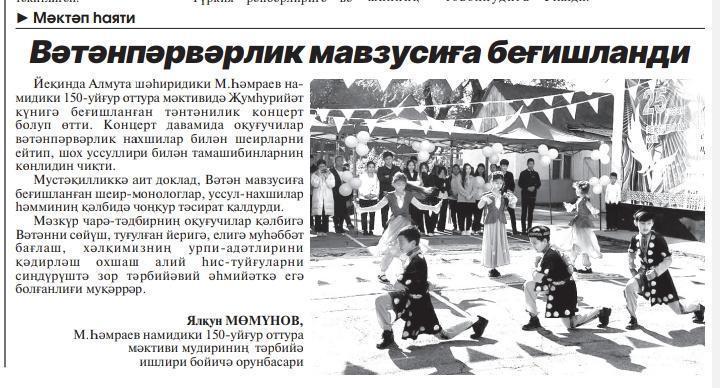 Республикалық қоғамдық-саяси "UIĞUR AVAZI" газетінің бүгінгі санында М.Хамраев атындағы №150 ЖББ мектебінде Республика күніне орай өткен мейрамдық концерт жарияланды.
