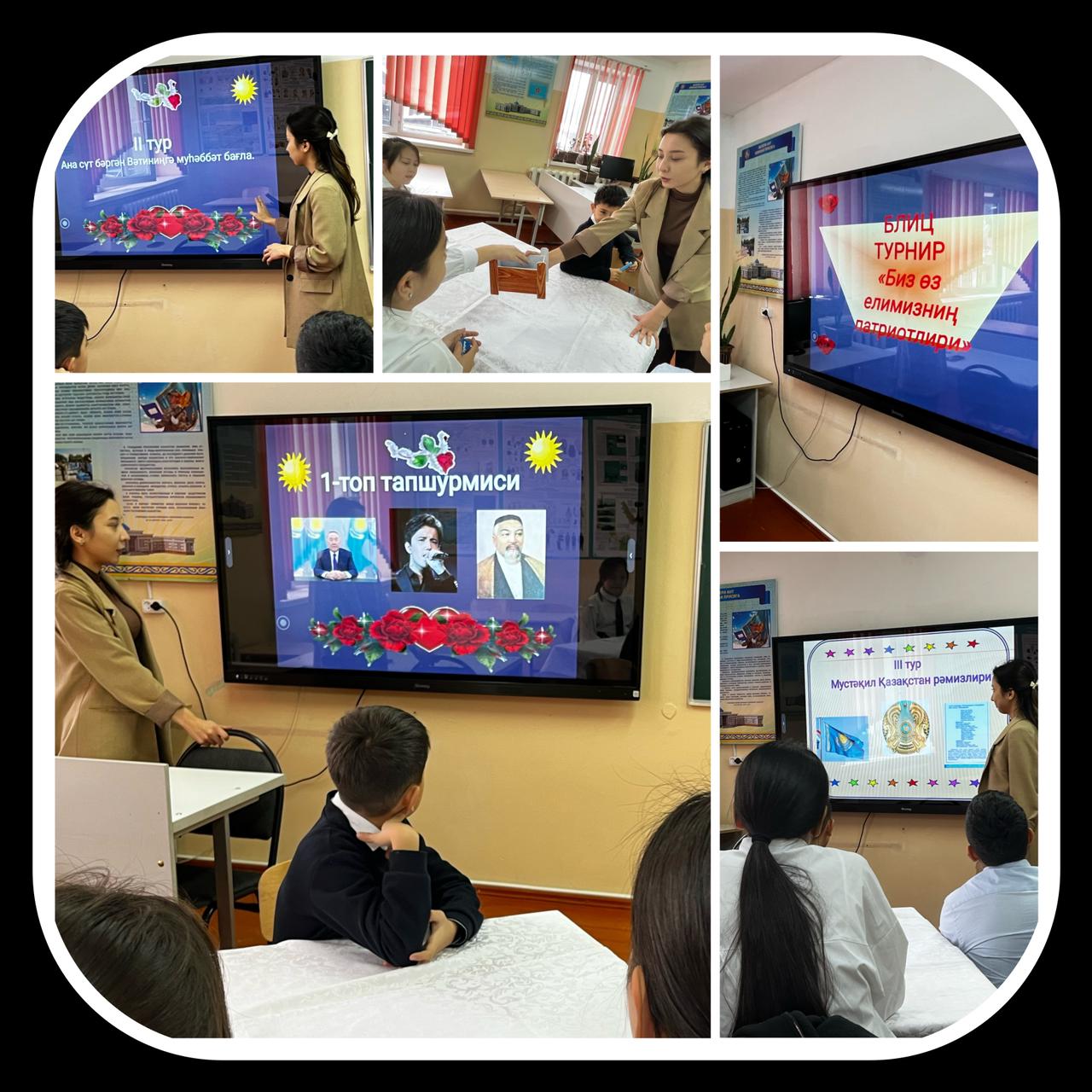 Алматы қаласы, Алатау ауданы М.Хамраев атындағы 150 ЖББ мектептің 6 “А”, “Б” сынып оқушыларымен “Біз өз еліміздің патриоттары” атты блиц турнир өткізілді. Турнир 5 бөлімге негізделіп,оқушылар Қазақстан Республикасының тарихы және өз елінің гүлденуіне үлесін қосқан атақты адамдары, мемлекеттік тіл-қазақ тілі туралы сұрақтарға жауап берді. Блиц турнирдың мақсаты:Оқушылардың танымдылық қабілеттерін дамыту. Отанға деген сүйіспеншіліктерін арттыру. Туған елінің тарихын терең білуге баулу.
