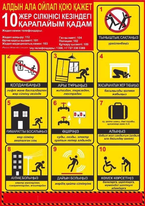 - көп қабатты үйлерде жер сілкіс аяқталған соң ғимараттан шығыңыз