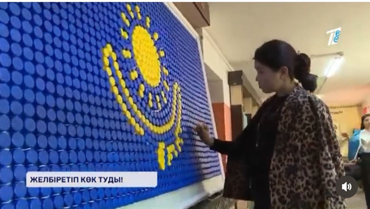 Пластикалық қақпақтардан жасалған үлкен Қазақстан Республикасының мемлекеттік туы