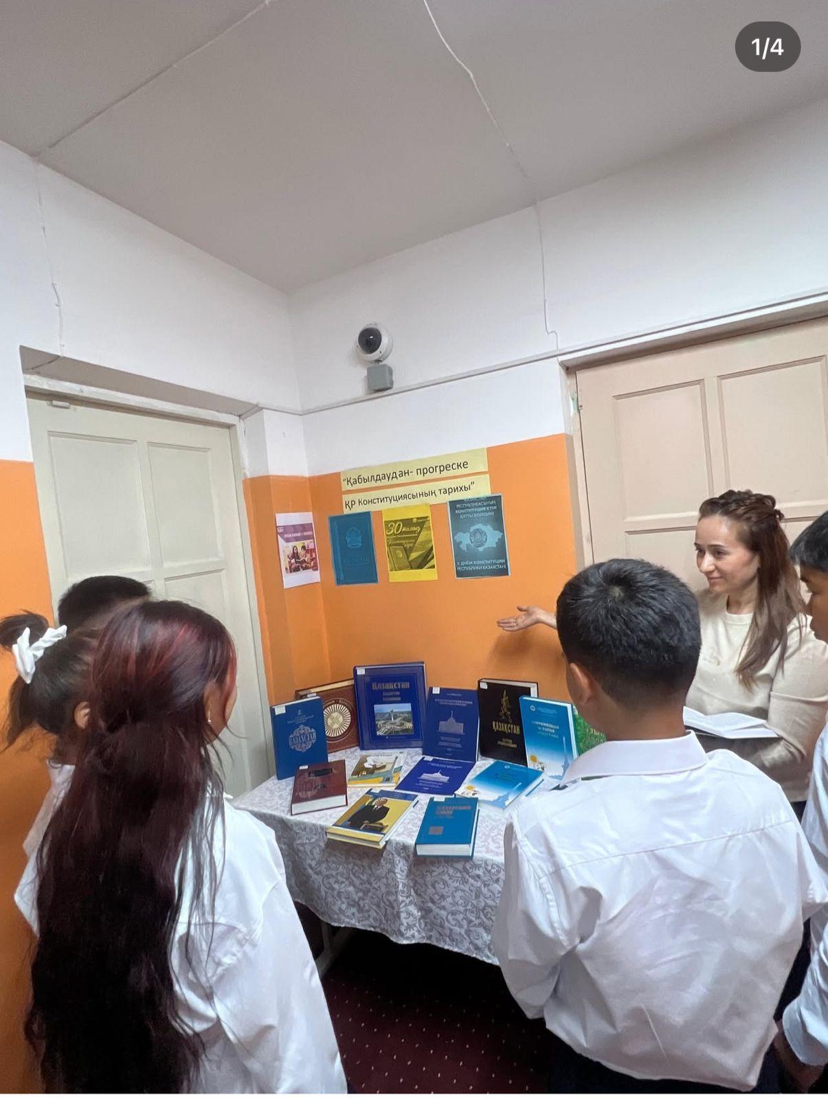 КГУ "Общеобразовательная школа №150 им.М.Хамраева » Ақпарат » М.Хамраев атындағы №150 ЖББ мектепте мектеп кітапханашысының ұйымдастыруымен Қазақстан Республикасының Тәуелсіздігінің 30 жылдығына орай «Қабылдаудан– прогреске: ҚР Конституциясының тарихы» атты кітап көрмесі ұйымдастырылды