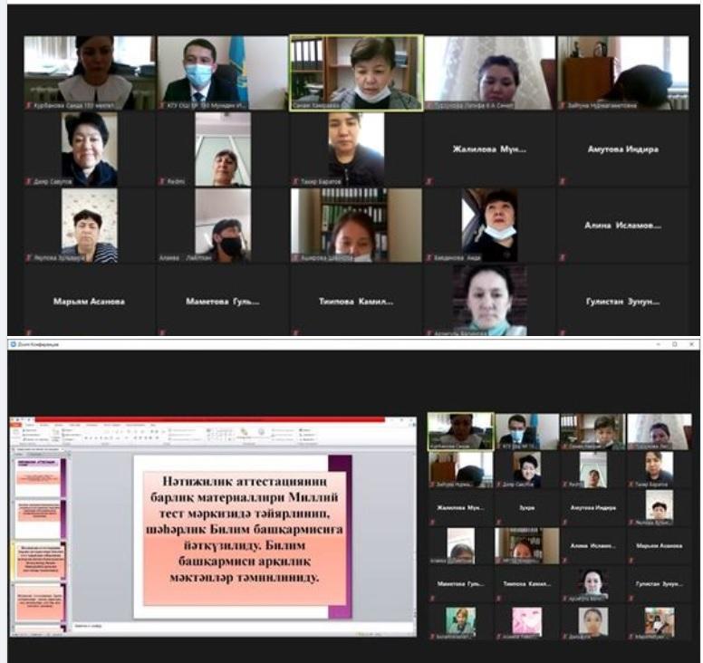 24-апрель күни М.Һәмраев намидики №150-мәктәпә ЗУУМ платформиси арқилиқ 5-9-синип оқуғучилириниң ата-анилири билән "Директорлуқ шәнбә- ата-анилар авази" намлиқ жиғин болуп өтти. Жиғин меһмини болуп Алатау наһийәсиниң Билим бөлүминиң йетәкчи мутәхәсиси Смагулова А.Б қатнашти. Жиғинни мәктәп мудириниң вәзиписини атқурғучи М.А.Имашев ечип , жиғинниң мәхсити вә күн тәртиви билән тонуштуруп чиқти. Мудирниң оқуш ишлири бойичә орунбасари Курбанова С.Н 9-синип оқуғучилириниң дөләтлик емтиһанлиридки өзгүришләр тоғрисида мәлумат бәрди. Мудирниң тәрбийә ишлири бойичә орунбасари Хамраева С.Н оқуғучиларниң тәртиви, дәрискә қатнишиши тоғрисида тохтилип өтти.
