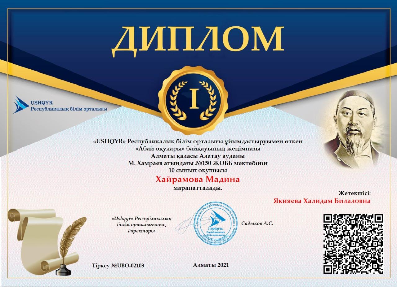 01 қараша 2021 0 І дәрежелі диплом 10 Б сынып оқушысы Хайрамова М Осы беттің QR-коды:QR-код этой страницы: